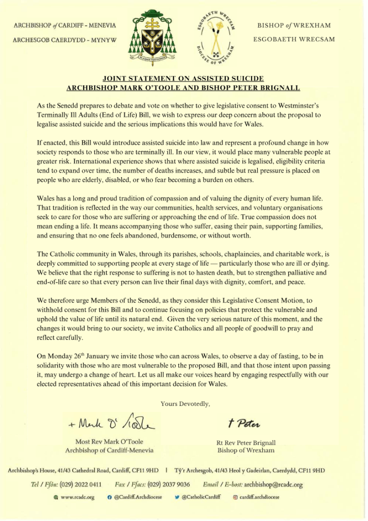 The Welsh Government has confirmed, through the Business Statement, that the Legislative Consent Motion on the Terminally Ill Adults (End of Life) Bill will be debated and voted on in the Senedd on Tuesday 27th January 2026.
