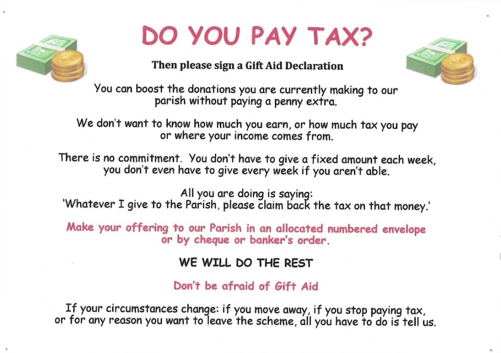 Bishop Peter has raised the subject of Gift Aid and the importance of actively recruiting donors in the Parishes and contacting existing donators to ask if they would like to review the amount they currently give. Consequently, a copy of the new Gift Aid forms together with questions and answers about the Gift Aid Scheme are available at the back of both churches.